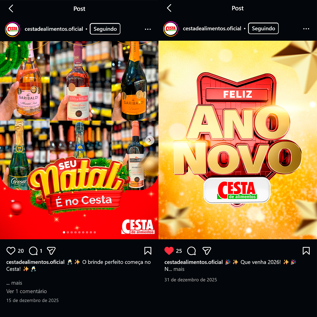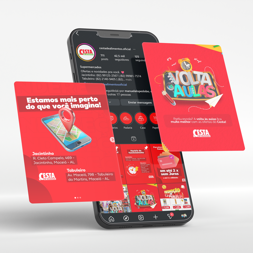 Toda a comunicação está direcionada ao público alvo principal do Cesta, com engajamento marcante e uso das redes para consultar produtos, preços e tirar dúvidas. Fomos responsáveis por criar, do zero, os perfis do Cesta nas redes sociais, como Instagram e WhatsApp, e até hoje fazemos o gerenciamento, com SAC e direcionamento para o setor responsável da empresa para o fechamento de possíveis vendas.
